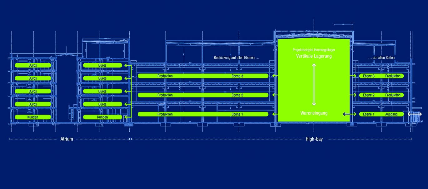 Um die Umwelt zu schützen, muss der Flächenverbrauch reduziert werden. Doch wie gelingt das in Zeiten einer wachsenden Weltbevölkerung und der steigenden Nachfrage nach Wohn- und Arbeitsraum? Ein möglicher Weg: Indem Gebäude in die Höhe gedacht werden. Im Hinblick auf Bürowelten ist das vollkommen selbstverständlich und gelebte Praxis. Anderes gilt bislang für Produktionsbetriebe: Fertigungs- und Lagerhallen entstehen vorwiegend auf weiten, horizontalen Flächen. Wer kennt nicht die großen Gebäude entlang der Autobahnen oder in Randlagen von Industriegebieten, weil städtische Gewerbegrundstücke in dieser Größenordnung rar und teuer sind? Ressourcenschonender wäre eine vertikale Fabrik. Hier werden Produktionsbereiche übereinander angeordnet und Einheiten optimal miteinander verknüpft, um die Effizienz der Prozesse zu steigern.