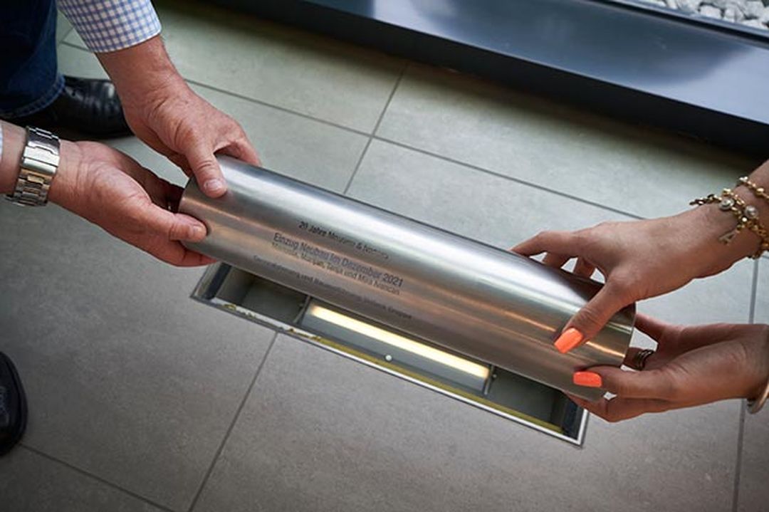 Im Mannheimer Gewerbegebiet Mallau wurde der Neubau für das Autohaus Ivancan in einem kleinen Festakt offiziell an die Eigentümerfamilie übergeben, die Inbetriebnahme war zum Jahresende erfolgt. Tanja Ivancan, Geschäftsführerin des Autohauses, und Claudius Uiker, Partner Vollack Süd, platzierten gemeinsam die Zeitkapsel im Eingangsbereich des Gebäudes.