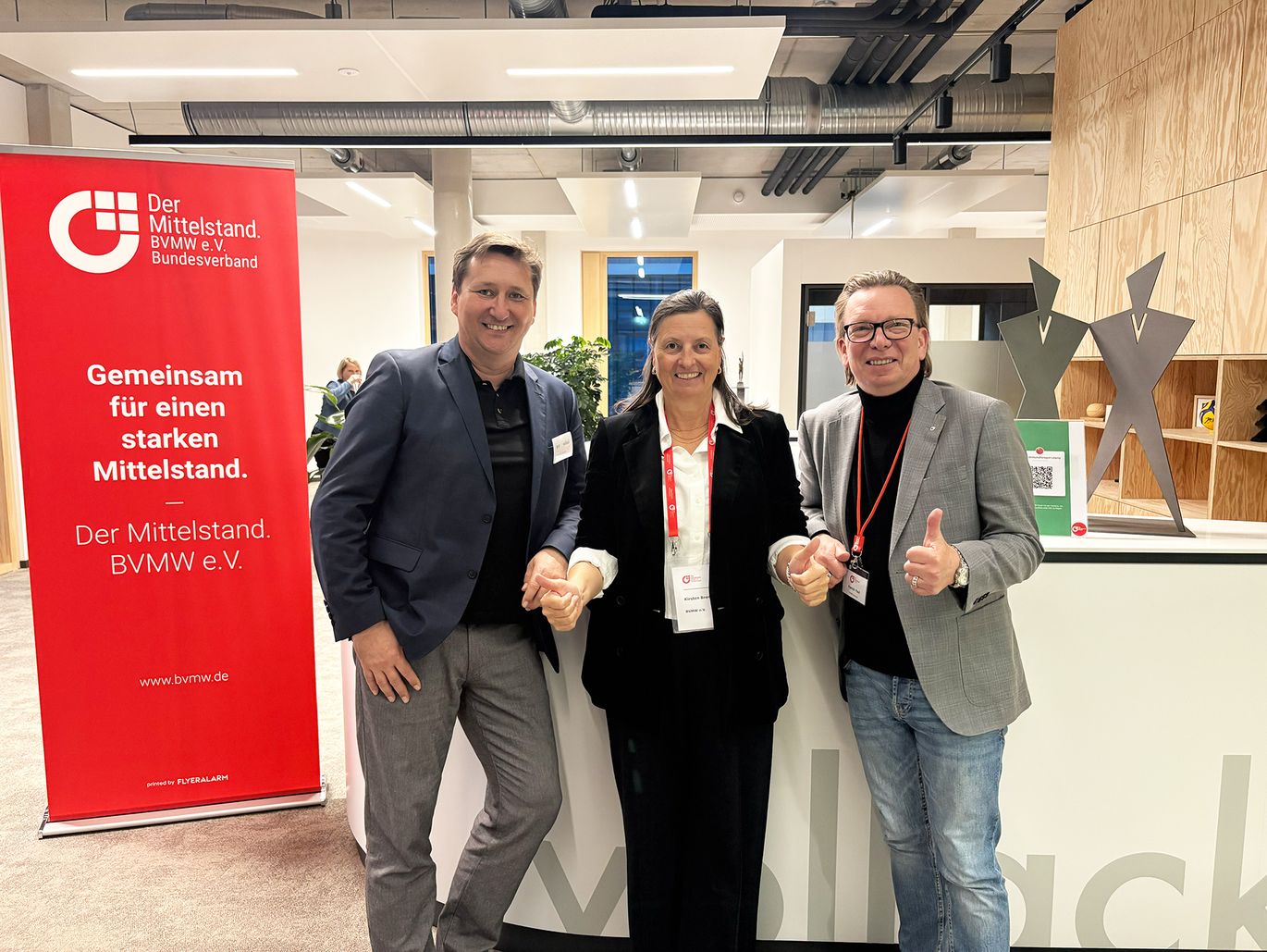 Von links: Frank Bornemann, Partner + Geschäftsführer Vollack Ost, mit Kirsten Bremer, Leiterin Kreisverband Leipzig beim BVMW, sowie Patrick Paul, Repräsentant Kreisverband BVMW Leipzig