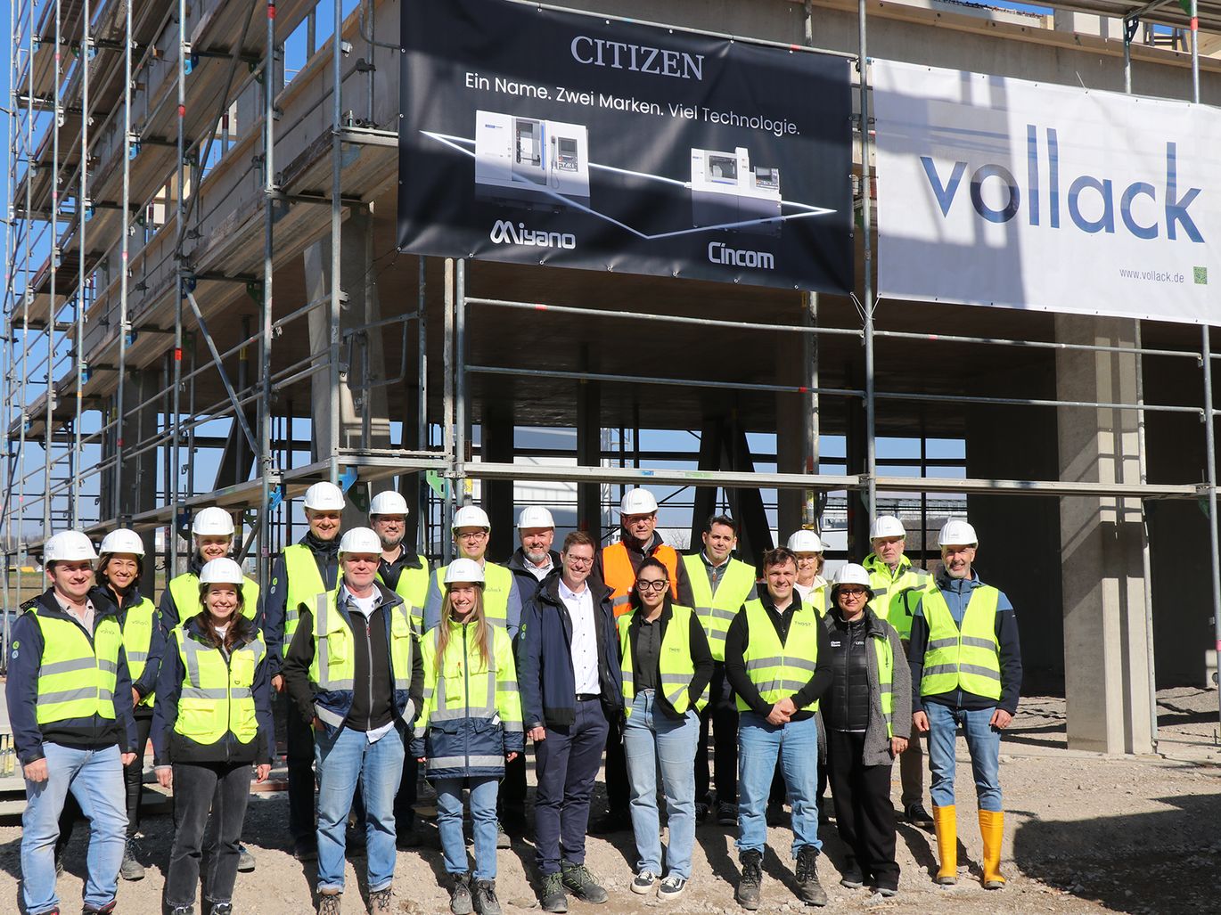 Gemeinsam für das Bauprojekt: Vertreter der Citizen Machinery Europe GmbH, der Vollack Gruppe sowie der THOST Projektmanagement GmbH beim Richtfest der neuen CME-Europazentrale in Ostfildern.