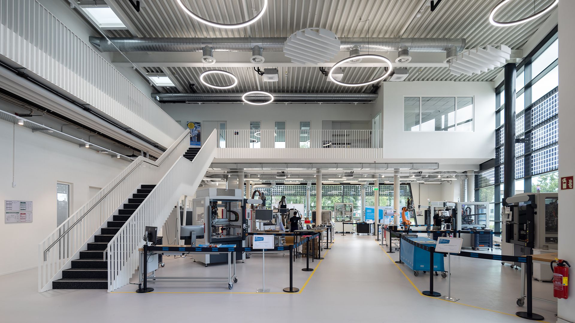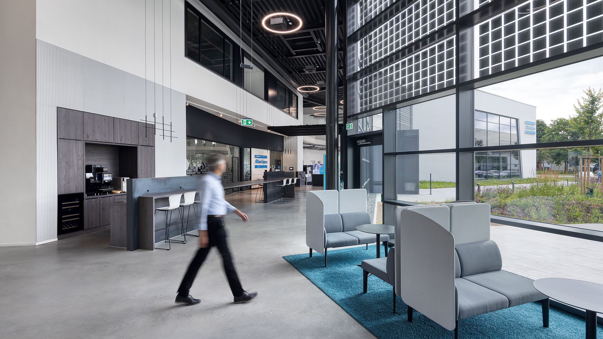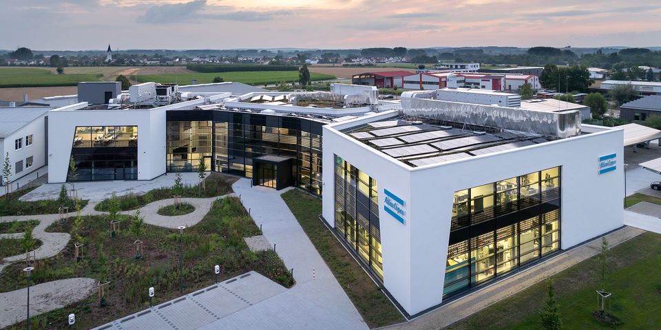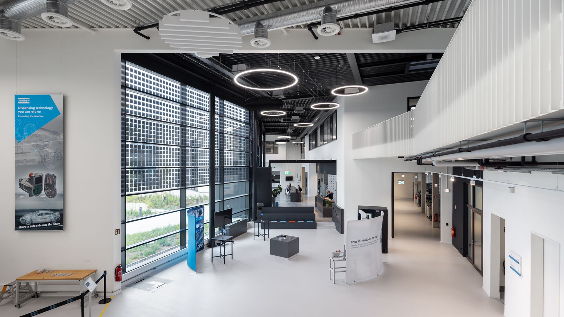 In Neustadt a.d. Donau the Electronics Competence Center at the headquarters of Atlas Copco, one of the world's leading solution providers of systems and equipment for bonding, dosing and potting processes, is an innovative location for electronics manufacturing technologies. The company has tripled its floor space with the architecturally sophisticated building, which is sustainable in all respects. The pioneering new building was constructed to the KfW 40 standard.