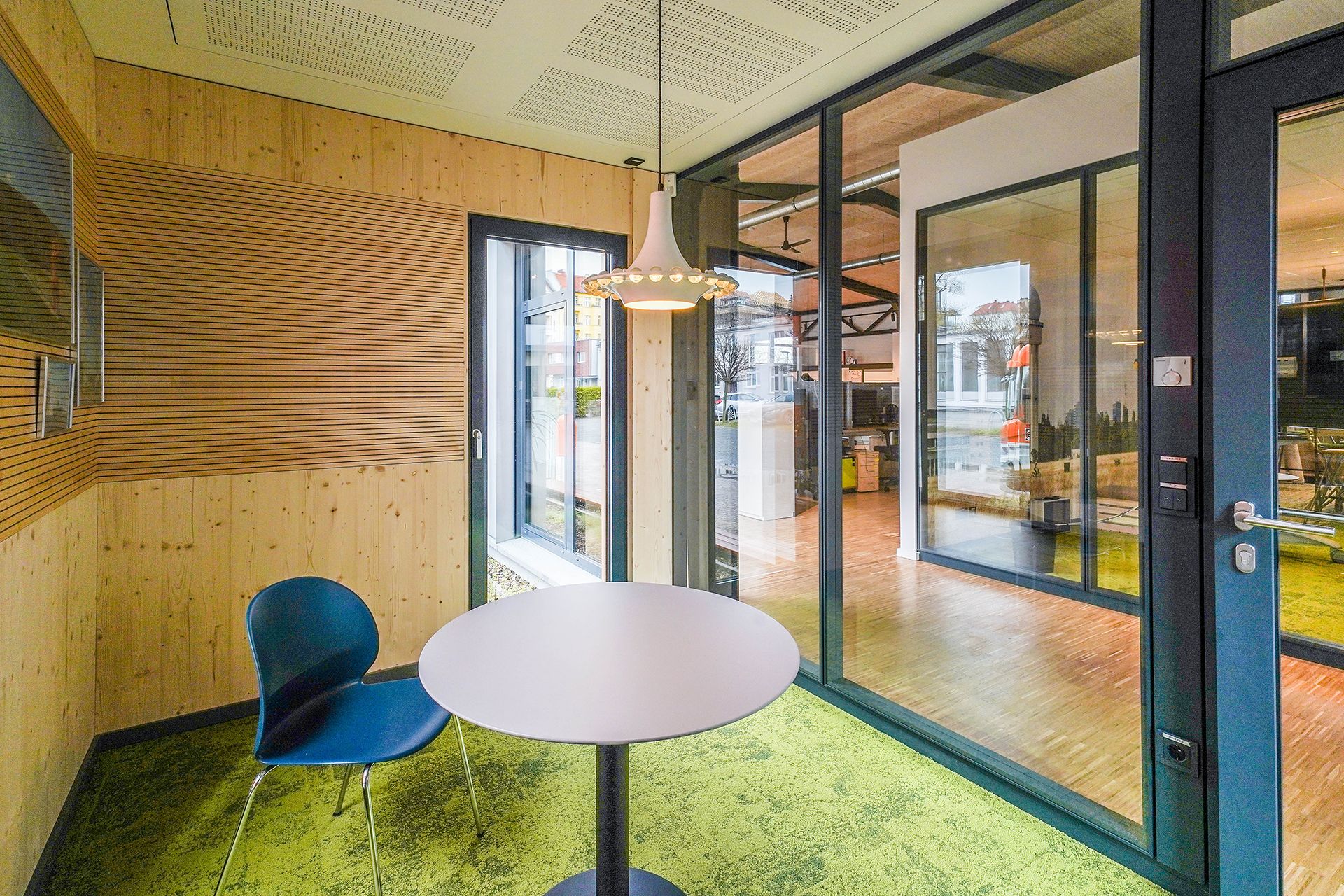 In order to conserve resources and take ecological aspects into account, the outer walls and the steel frame as well as almost all of the hall's roof purlins were retained. The existing floor slab was reused and only filled to the final level. Wooden façade modules, with real wood acoustic panels on the inside, were blown in with cellulose insulation made from recycled paper. They create a pleasant working atmosphere, dampen noise and give the room a unique aesthetic. The durable larch wood comes from sustainable forestry. The zinc façade panels not only lend a modern aesthetic, but are also recyclable.