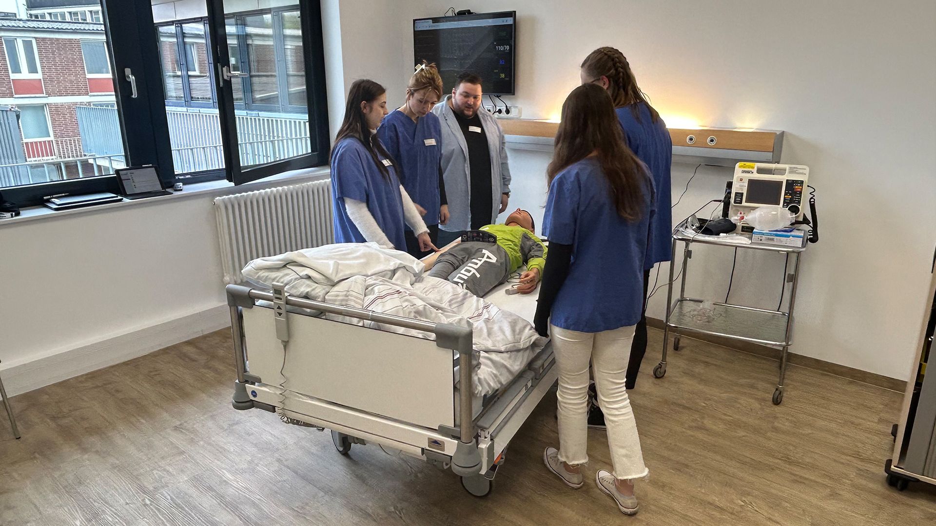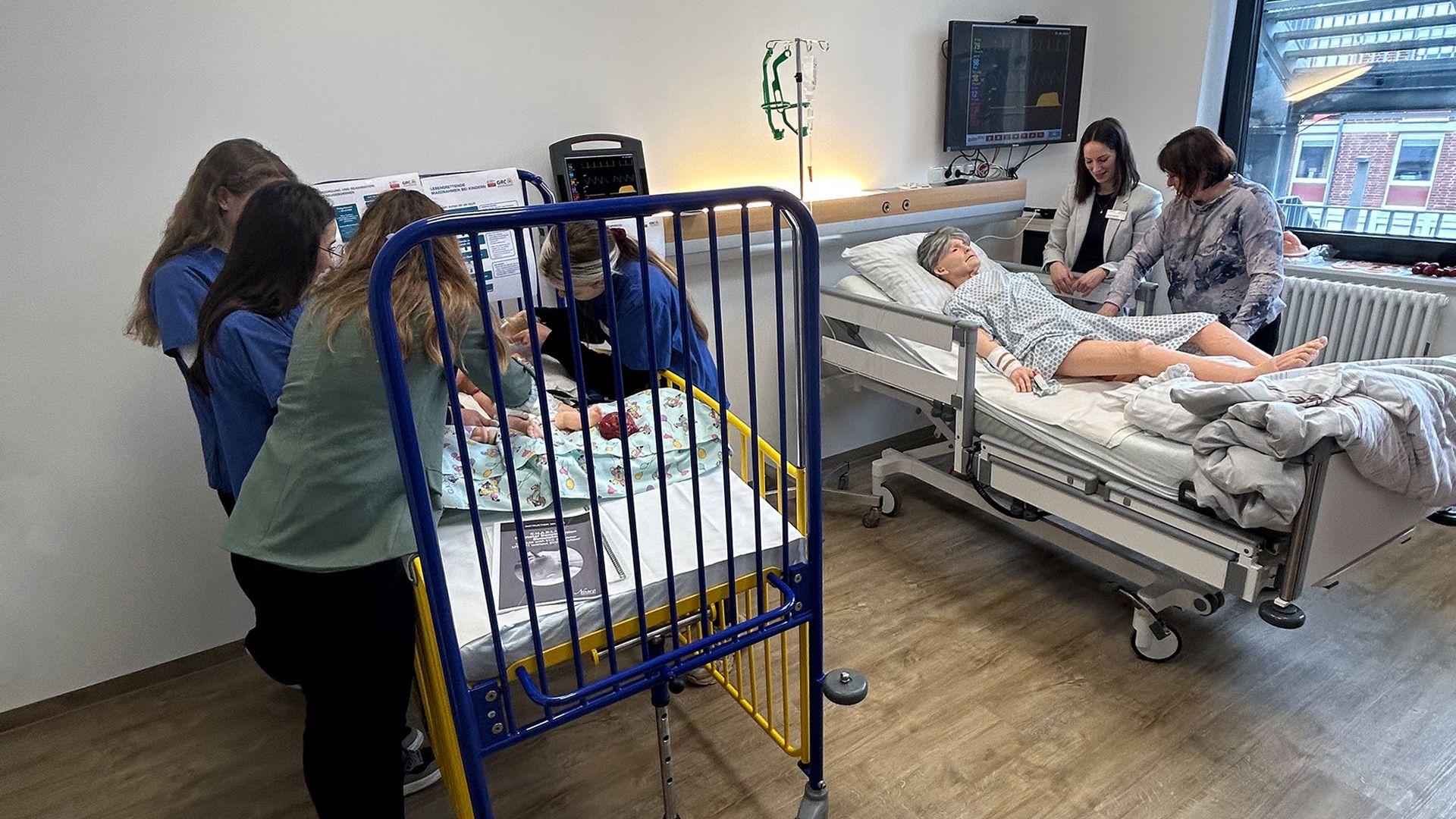 In a so-called SkillsLab, two patient rooms have been set up with modern, computer-controlled simulation phantoms for practical training. Both patient beds are captured by a camera that can transmit the image to every classroom. Trainees benefit from large, interactive touch displays in all classrooms as well as auto-tracking cameras for hybrid teaching.
