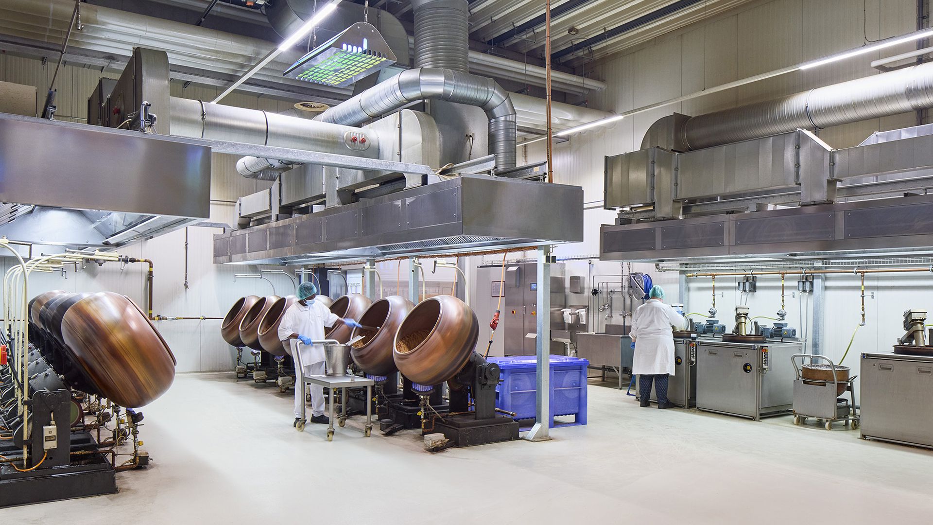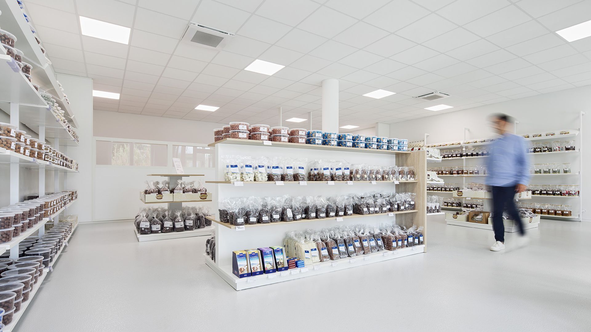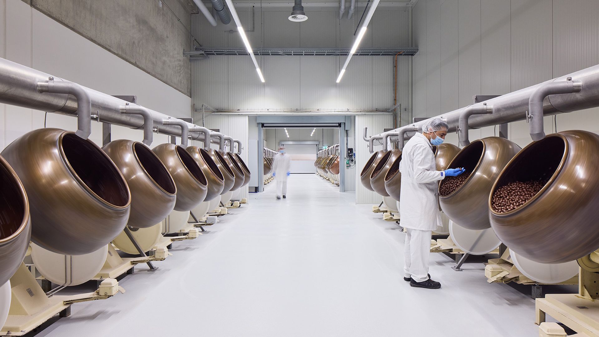 The new, approximately 12,200-square-meter facility of the confectionery manufacturer Weseke Dragees is located just about 500 meters from the old site. Production and warehouse facilities occupy the majority of the space. They are connected to the single-story administrative building, which houses the offices, break rooms, changing rooms, and the factory outlet.