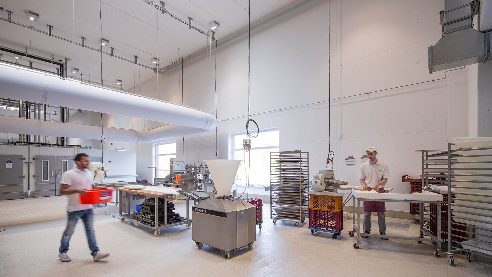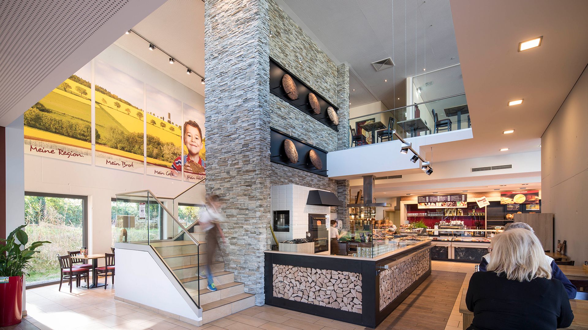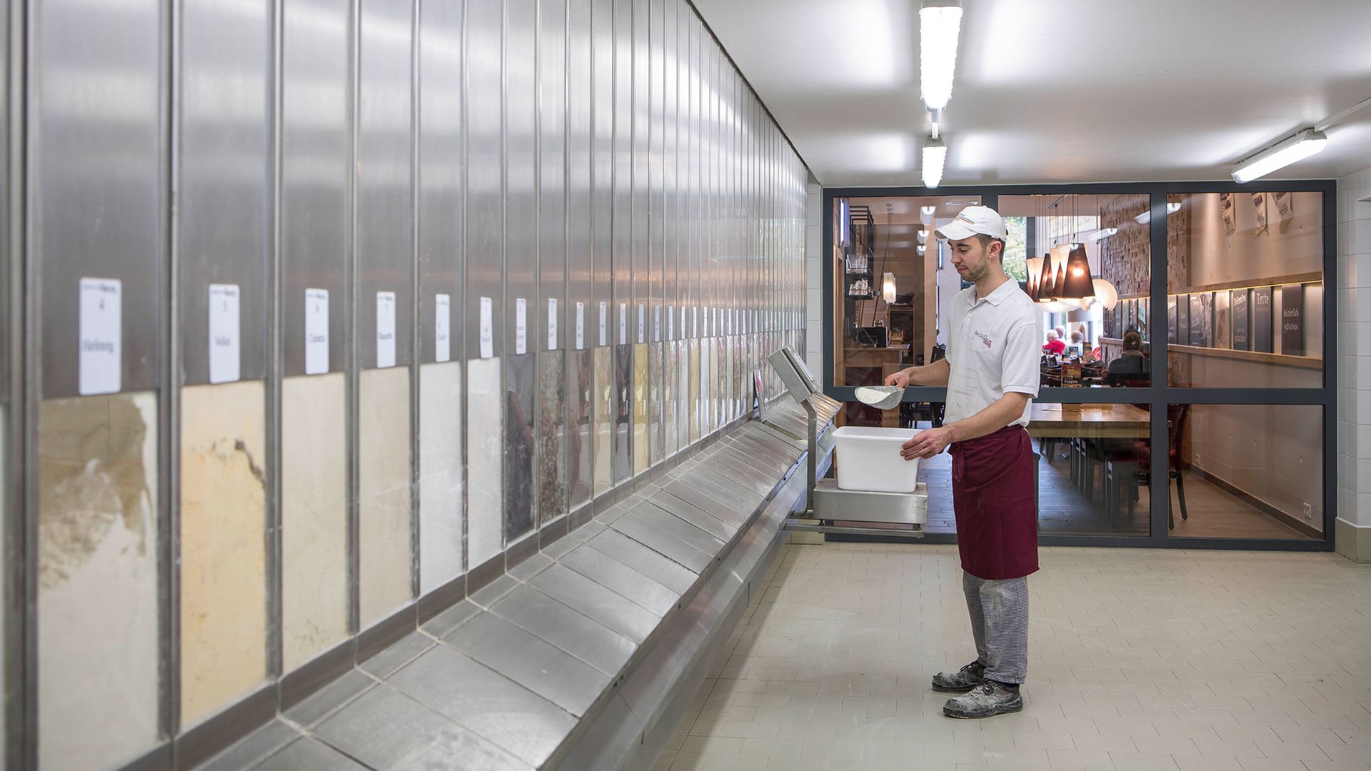 Mit der gläsernen Backstube wird die handwerkliche Arbeit, die von modernster Technik unterstützt wird, transparent. Auf einer Fläche von über 1.000 Quadratmetern werden Back- und Konditoreiwaren für 11 Filialen im Main-Taunus-Kreis qualitativ hochwertig und effizient hergestellt.