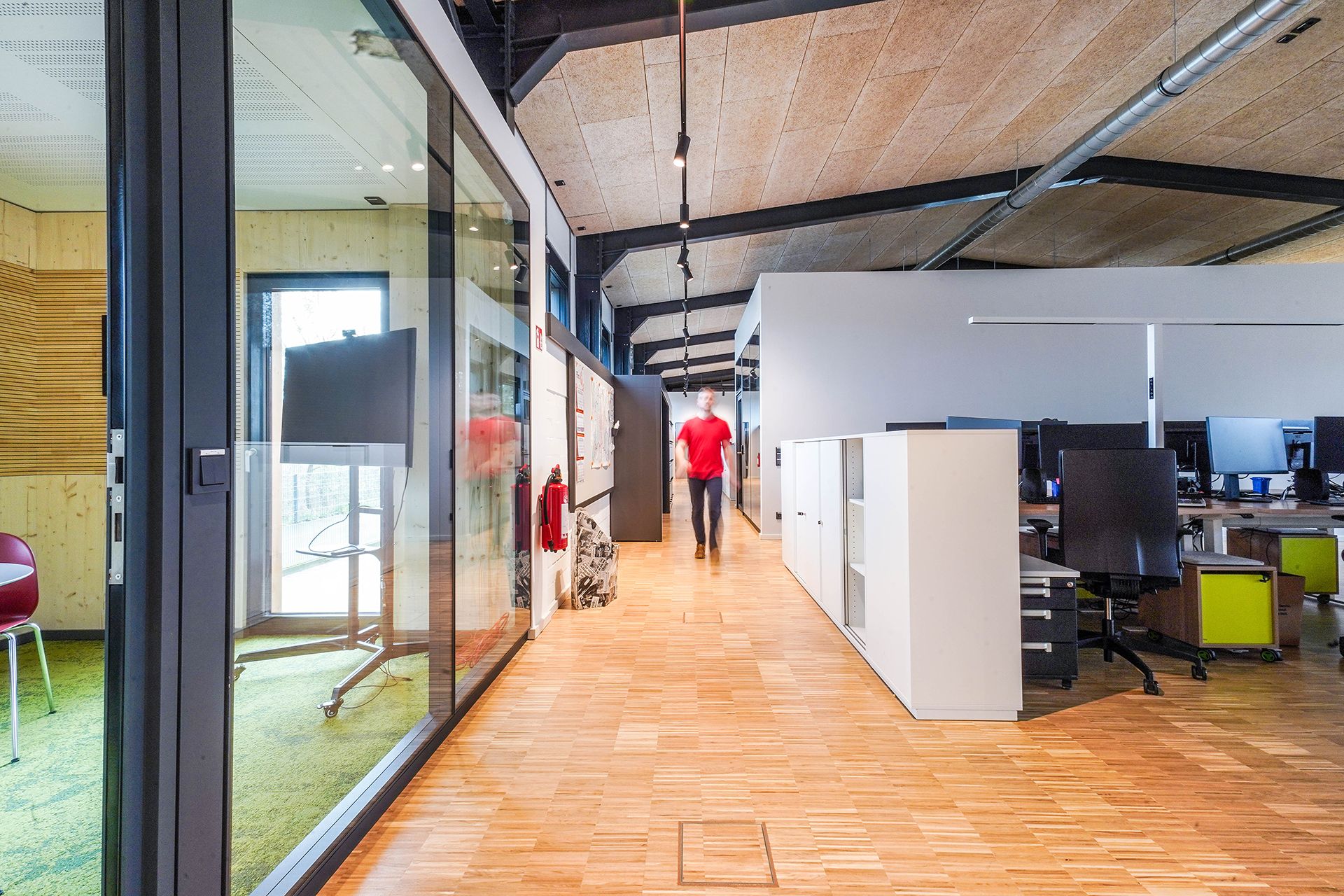 Um Ressourcen zu schonen und ökologische Aspekte zu berücksichtigen, wurden die äußeren Mauern und das Stahlgerippe sowie fast alle Dachpfetten der Halle beibehalten. Die vorhandene Bodenplatte wurde weitergenutzt und nur auf das Endniveau aufgefüllt. Holzfassadenmodule, innenseitig mit Echtholz-Akustikpaneelen, wurden mit einer Dämmung aus Zellulose, hergestellt aus Altpapier, ausgeblasen. Sie schaffen eine angenehme Arbeitsatmosphäre, dämpfen Lärm und verleihen dem Raum eine einzigartige Ästhetik. Das langlebige Lerchenholz stammt aus nachhaltiger Forstwirtschaft. Die Fassadenbleche aus Zink verleihen nicht nur eine moderne Ästhetik, sondern sind recyclebar.