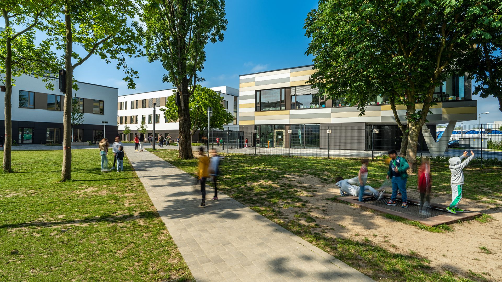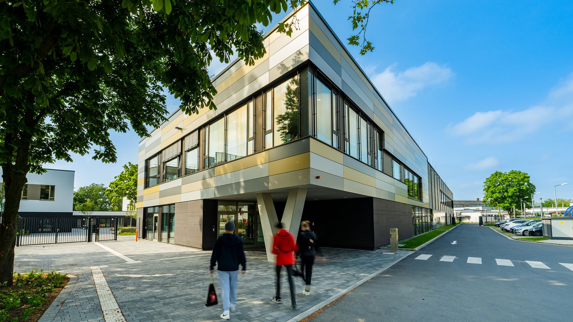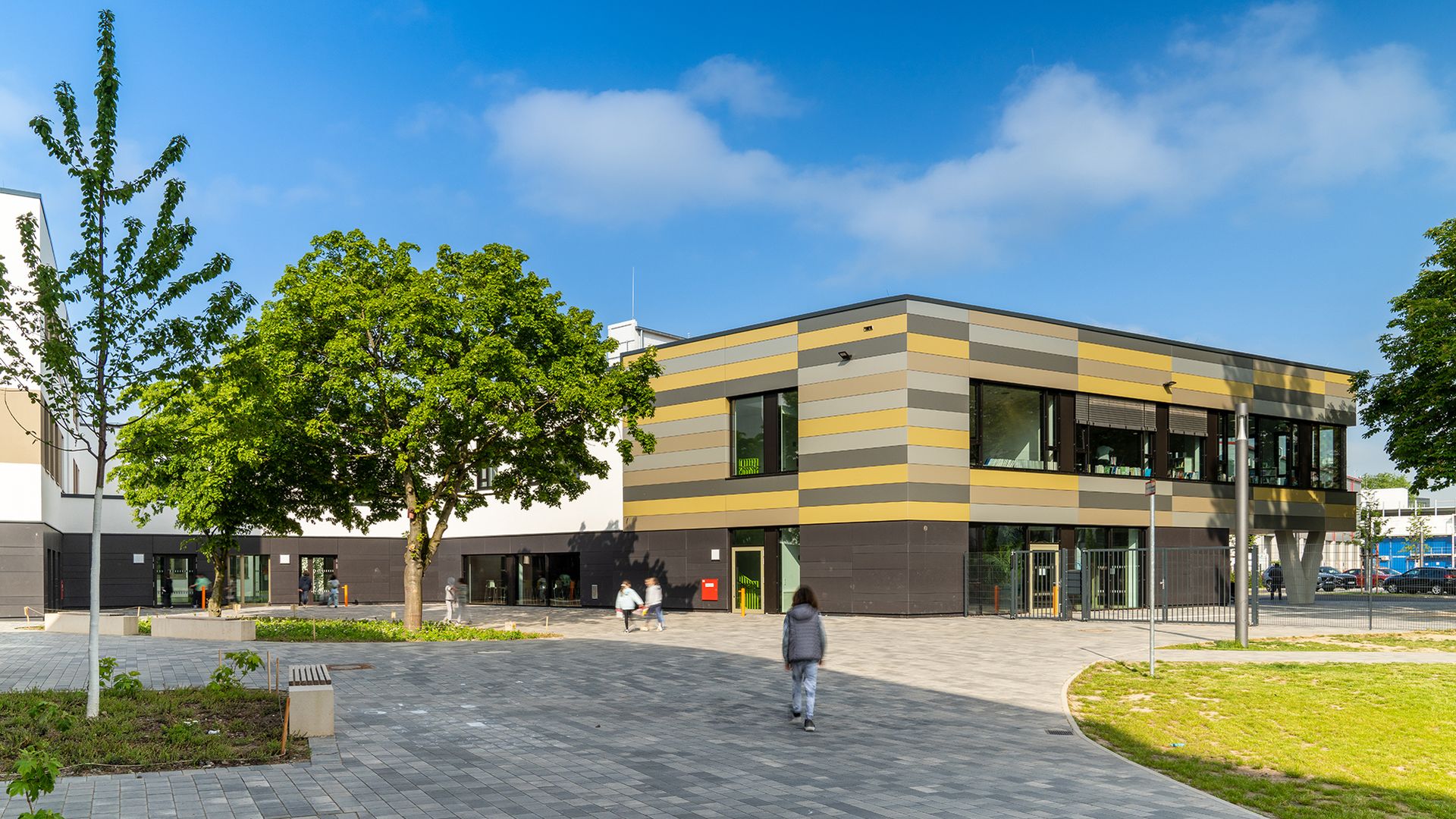 Das dreigeschossige Gebäude bietet flexible Lern- und Spielumgebungen, eine Sporthalle, moderne Fachumgebungen für Naturwissenschaften, Musik und Kunst sowie eine offene Mensa und Aula mit Bibliothek. Nachhaltigkeit ist Trumpf: Eine Photovoltaikanlage auf dem Dach deckt 80 Prozent des benötigten Energiebedarfs und spart 30 Tonnen CO2 pro Jahr ein.