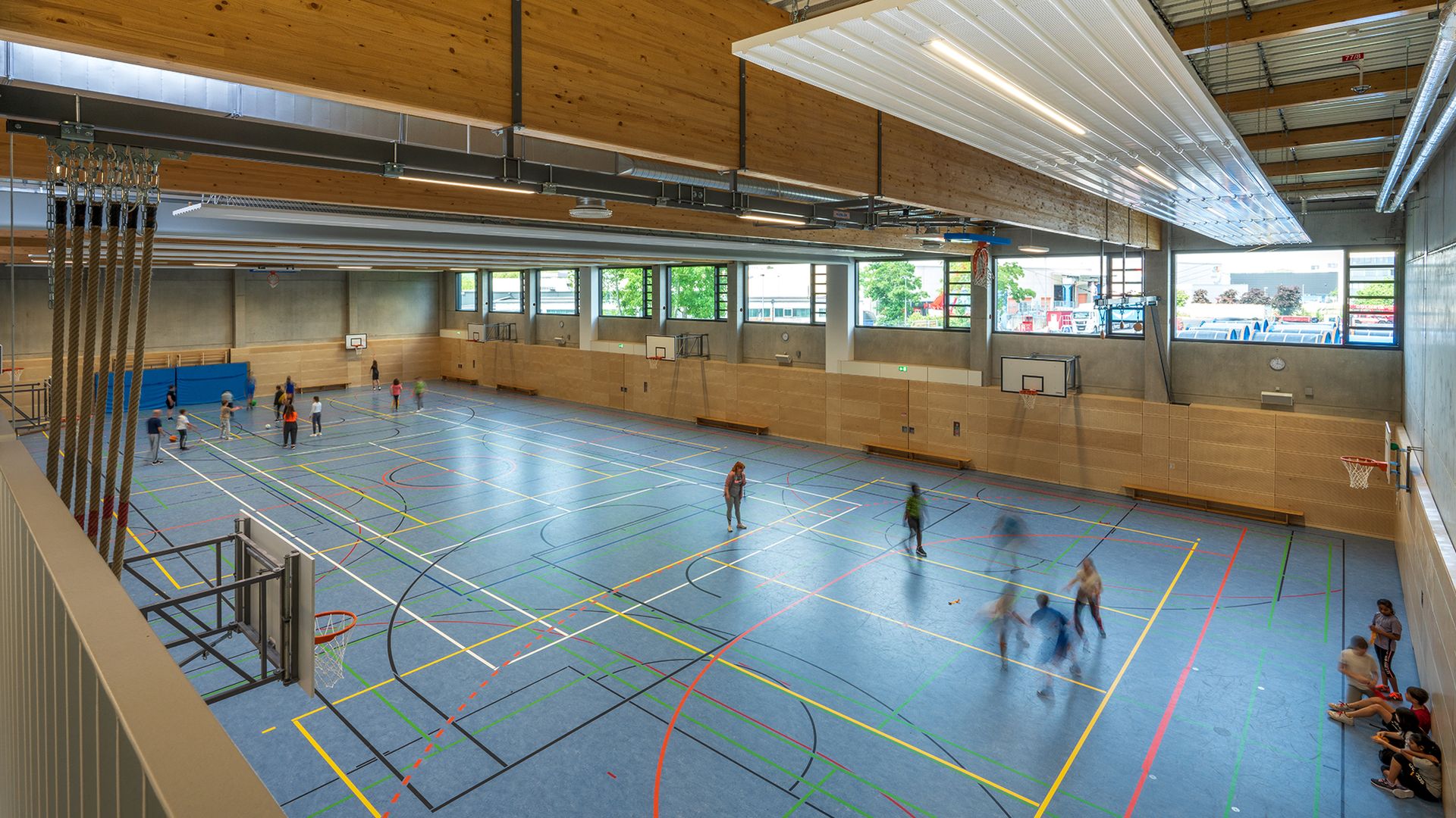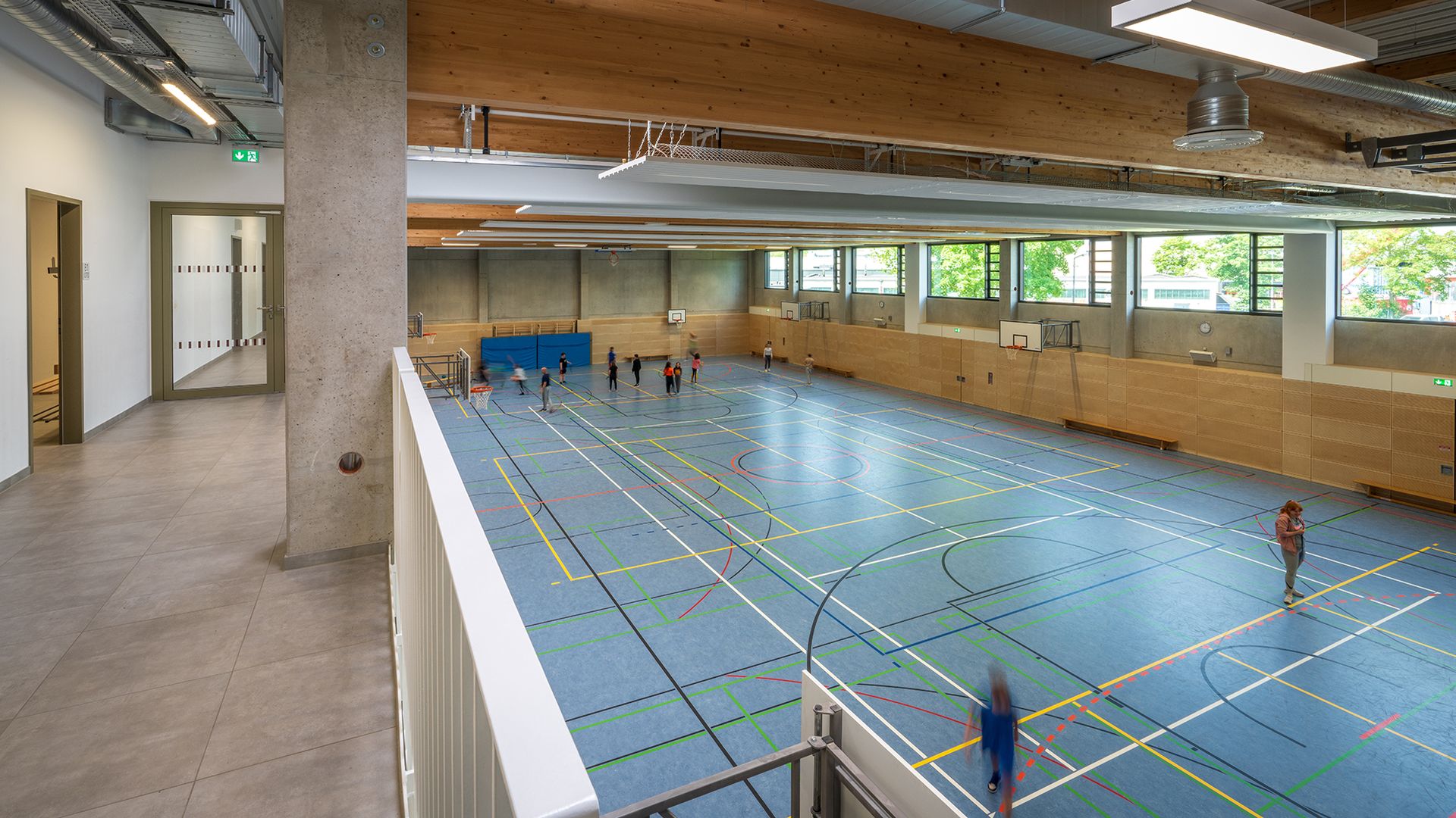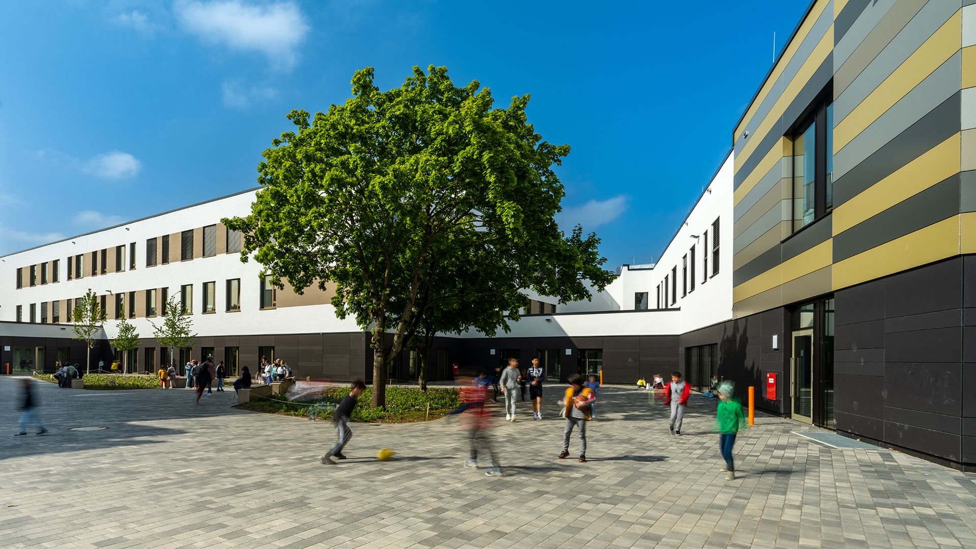 Das dreigeschossige Gebäude bietet flexible Lern- und Spielumgebungen, eine Sporthalle, moderne Fachumgebungen für Naturwissenschaften, Musik und Kunst sowie eine offene Mensa und Aula mit Bibliothek. Nachhaltigkeit ist Trumpf: Eine Photovoltaikanlage auf dem Dach deckt 80 Prozent des benötigten Energiebedarfs und spart 30 Tonnen CO2 pro Jahr ein.