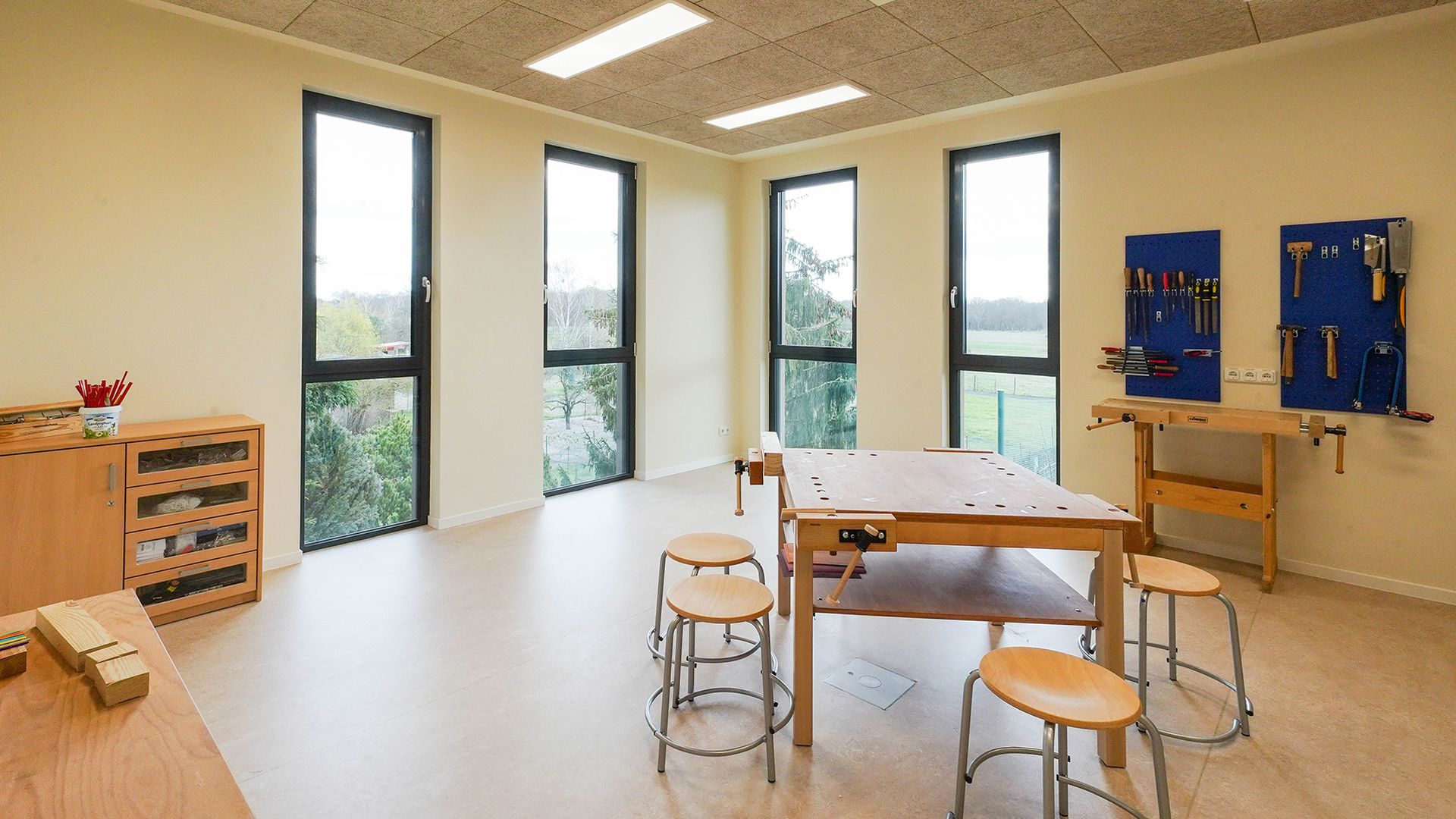 Inmitten eines denkmalgeschützten Ensembles und in einer Trinkwasserschutzzone gelegen, entstand bei laufendem Kita-Betrieb ein ressourcenschonender Hortneubau in nachhaltiger Holzbauweise für den Verein Oberlinhaus. Das rund 900 Quadratmeter große Gebäude eröffnet für 95 Kinder mit und ohne Behinderung durch zahlreiche bodentiefe Verglasungen immer neue Perspektiven.