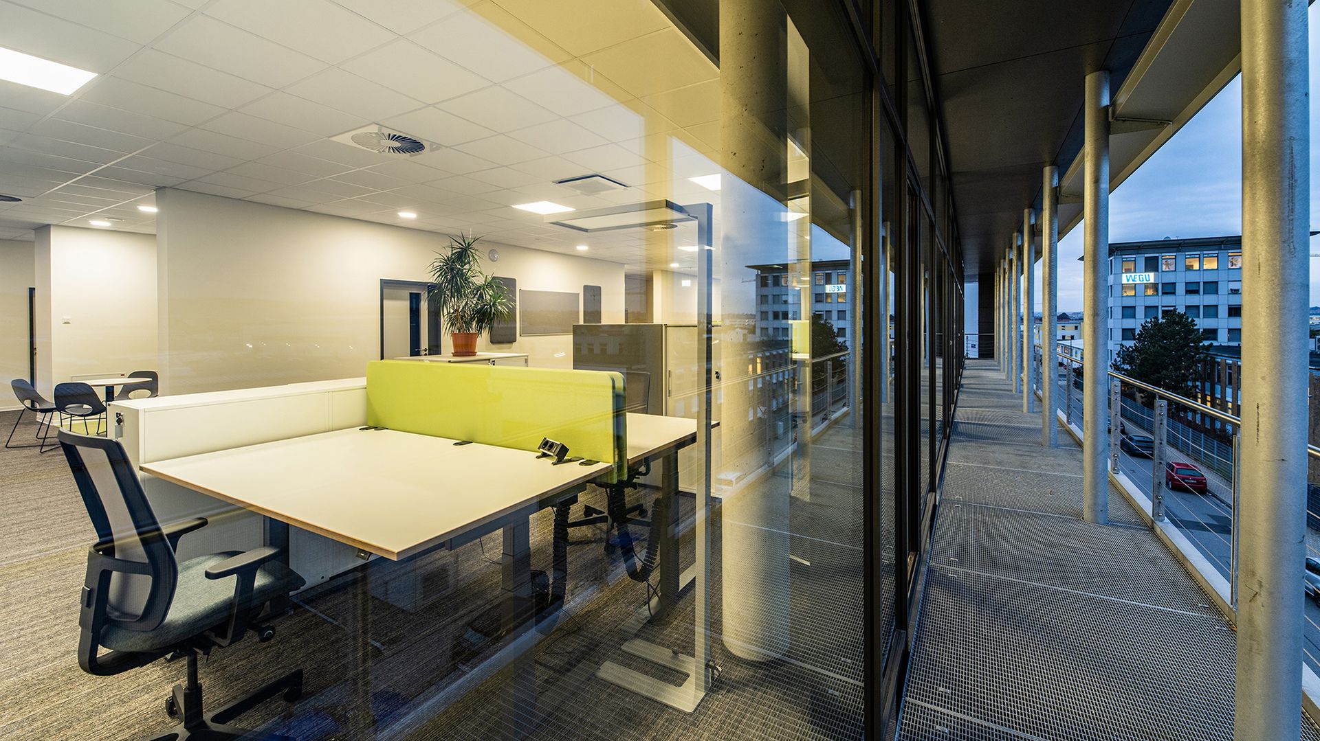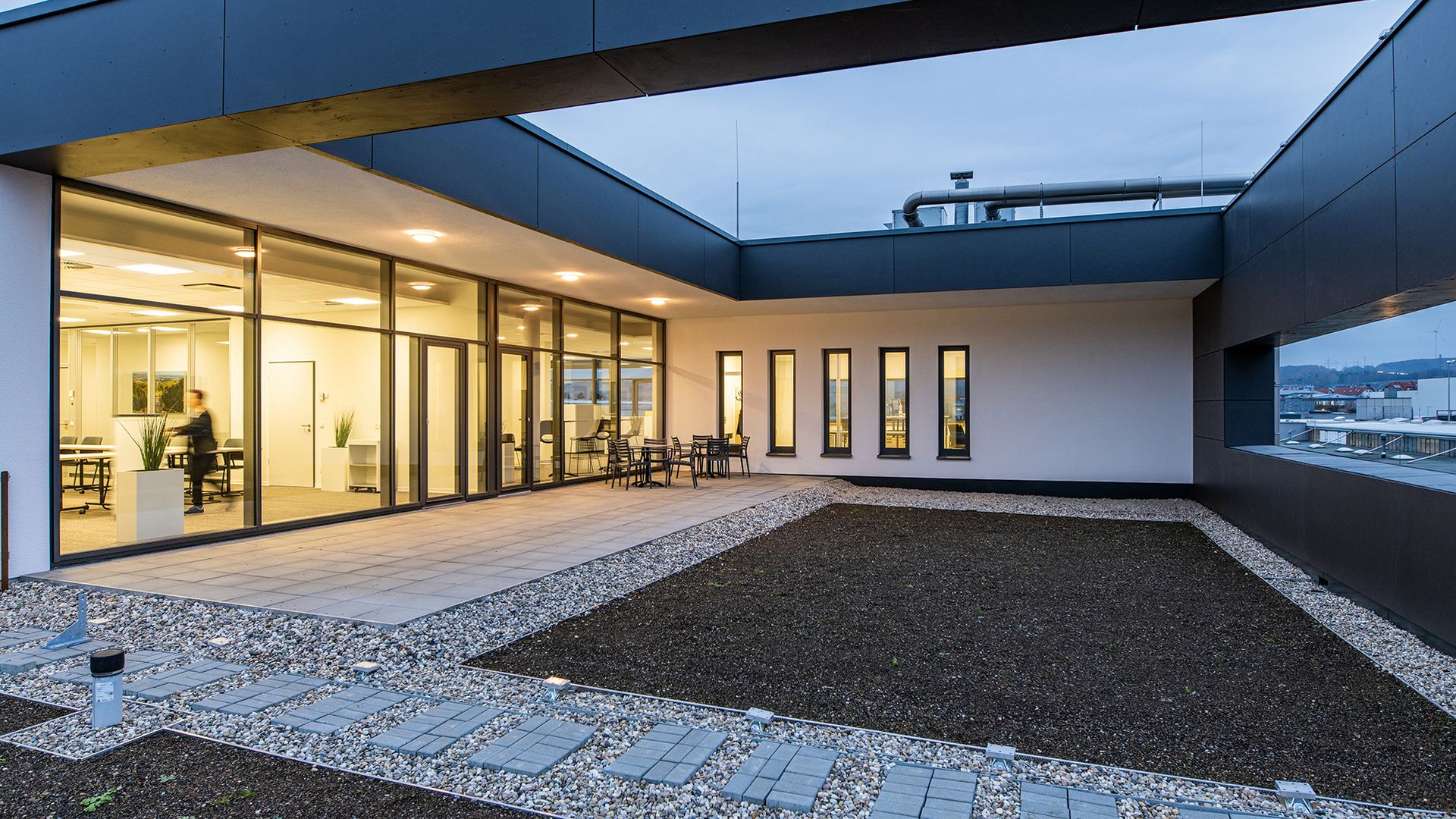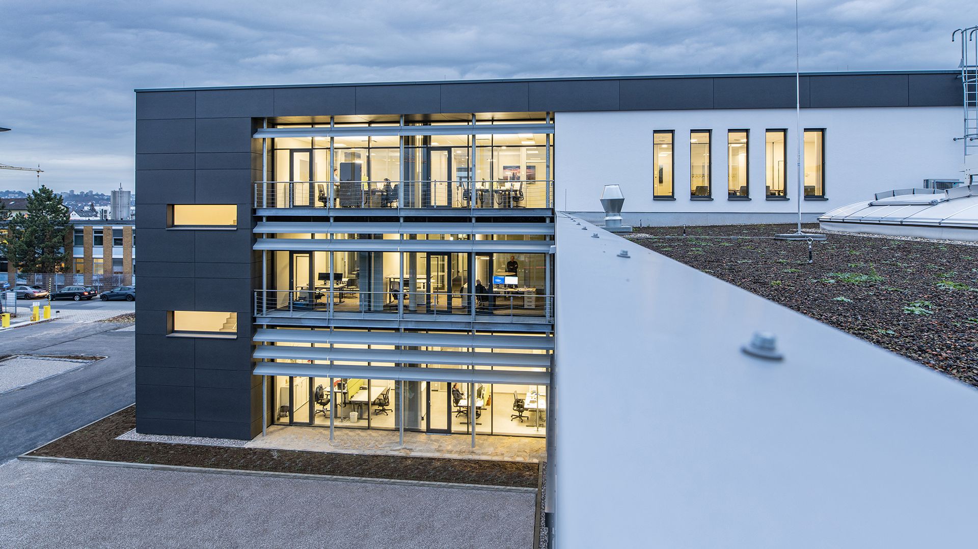 Den Büroarbeitsplätzen vorgelagerte Balkone schaffen eine besonders hohe Arbeitsqualität und gliedern, ergänzt durch Horizontallamellen, die Fassadenstruktur. Ein zweigeschossiger Gebäudeabschnitt verzahnt sich funktional mit dem höheren Bereich und bietet Flächen für Produktion, Lager und Gebäudetechnik.