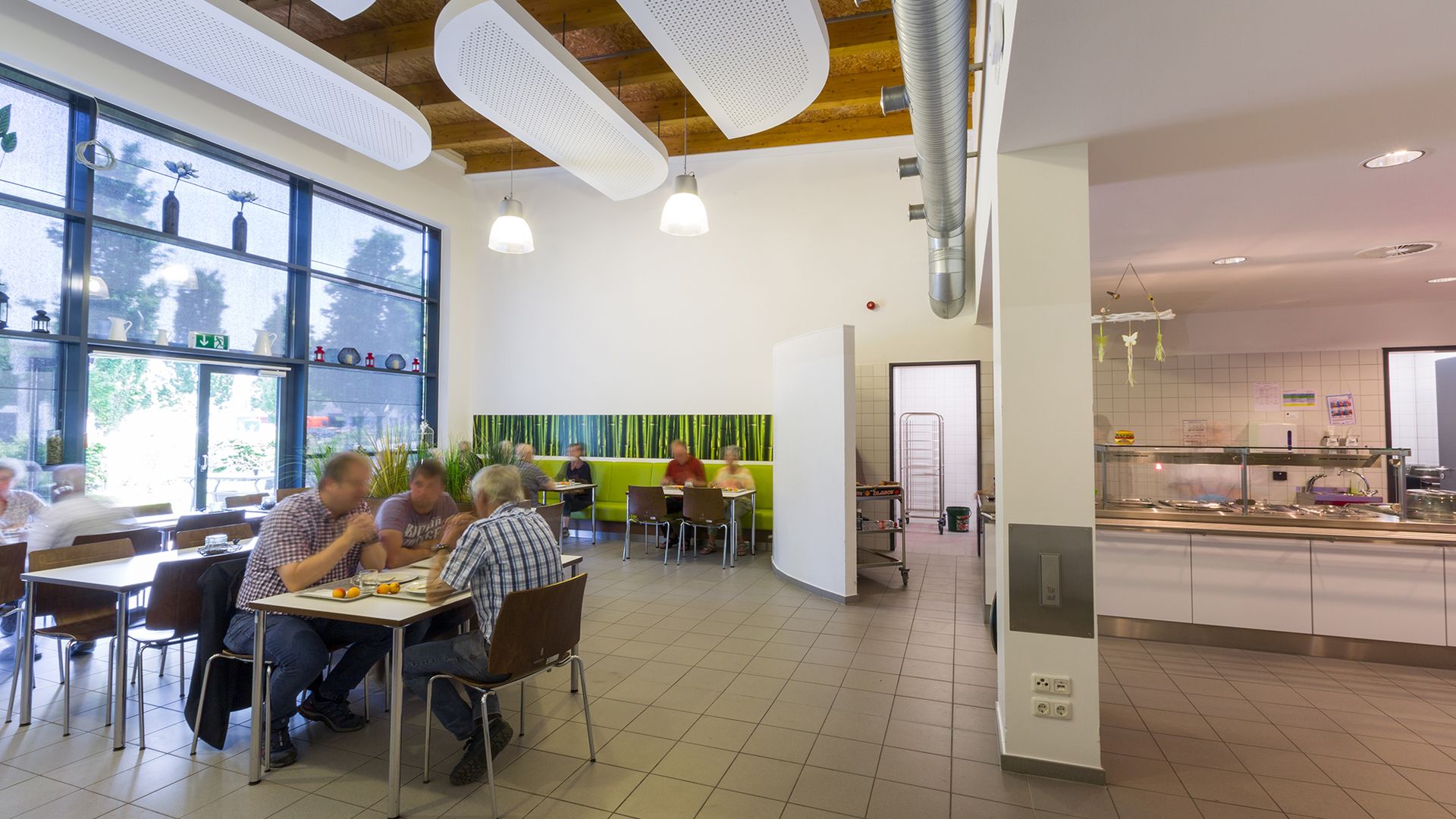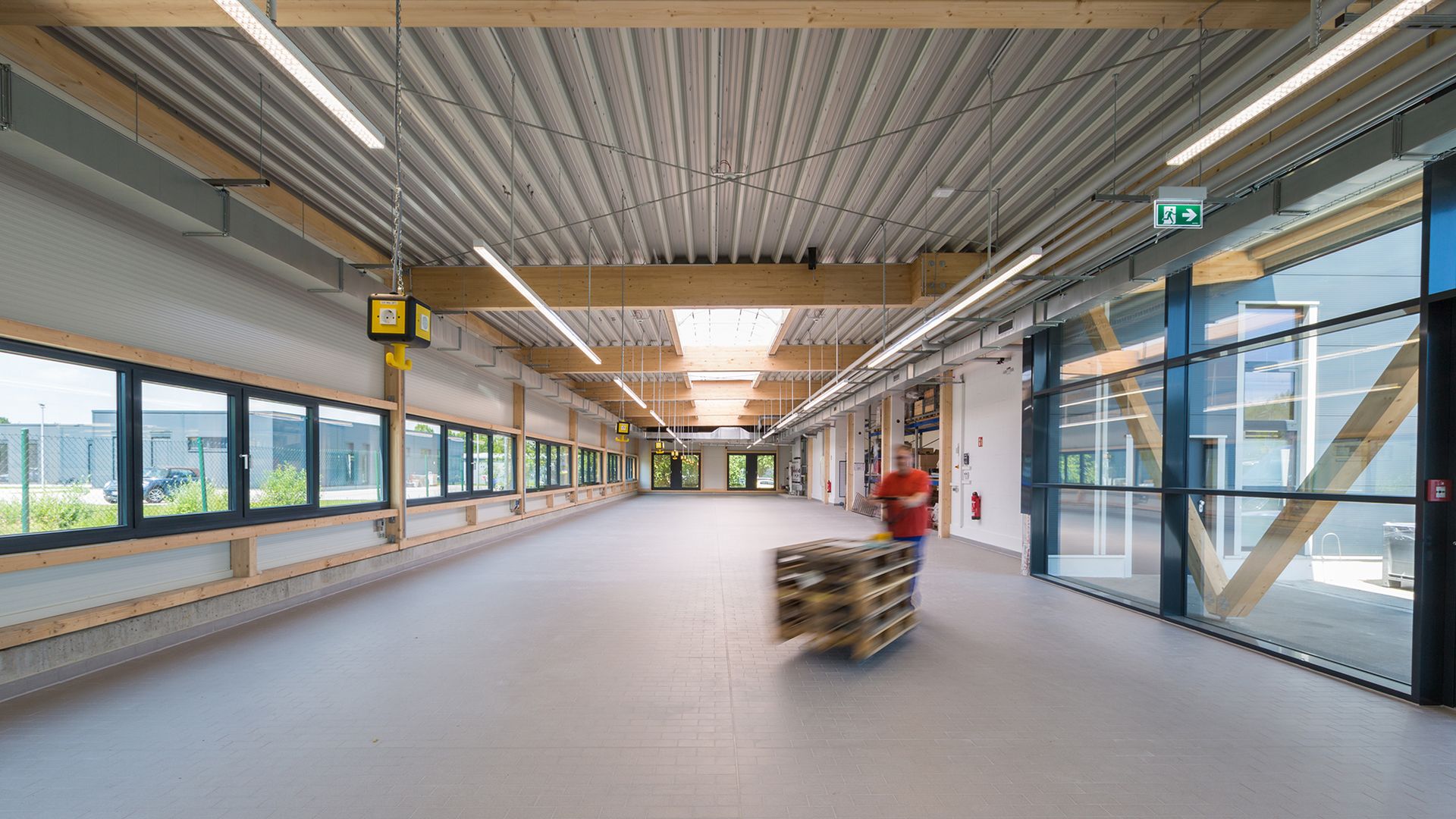 Glas und Holz prägen den rund 1.400 Quadratmeter großen Erweiterungsbau der wewole STIFTUNG. Diese Fläche wird künftig für Werkstatt, Büro und Lager genutzt. 80 neue Arbeitsplätze ermöglichen Menschen mit Behinderungen selbstbestimmtes Arbeiten. Ein Gruppenraum, der von allen genutzt werden kann, komplettiert die hellen und modernen Räumlichkeiten.