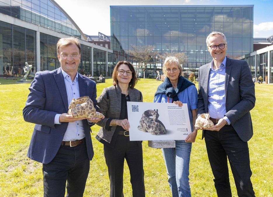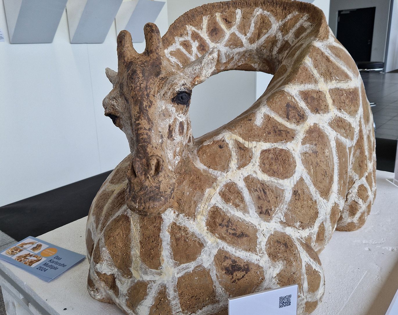 Mit ihrem langen Hals und ihrer einzigartigen Fellzeichnung gehört die Giraffe zu den eindrucksvollsten Bewohnern Afrikas, bedroht sind alle unterschiedlichen Arten. Das Karlsruhe Multiple 2024 zeigt eine Netzgiraffe. Nur sehr selten kann man die Tiere in so ungewöhnlicher Haltung sehen. Nur, wenn sie sich sehr sicher fühlen, nehmen sie diese entspannte Position ein. Kunstwerk „Sabana“ – von Künstlerin Irmela Maier geschaffen – greift den Ursprung der Bezeichnung ihres Lebensraumes auf: Das Wort ist die karibisch-spanische Bezeichnung für Savanne.